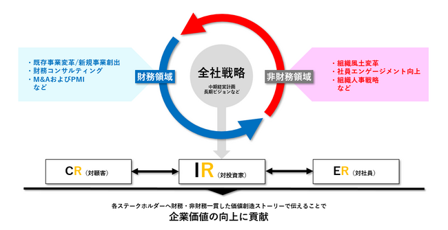 企業価値向上の実現には、経営陣だけではなく経営企画部門、IR部門、事業部門、広報部門など、さまざまな関係者の連携が必要です。しかし機能分化が進む上場企業においては、戦略策定から実行までを組織横断で十分に推進できていないケースが多く、部門を横断して統合的に支援・推進できるパートナーを求める傾向がみられます。
