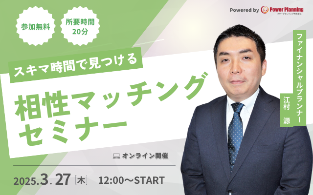 無料マネーセミナー提供サービス「アットセミナー」を運営しているパワープランニング株式会社が「3月27日 (木)12時」に「相性マッチングセミナー」というスキマ時間で自分に合ったFPを見つけられるオンラインセミナーを開催いたします。