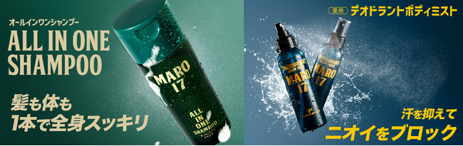 株式会社ネイチャーラボ(本社:東京都渋谷区)が展開するメンズケアブランド『MARO17(マーロセブンティーン)』は、汗をおさえてニオイをブロックできる「MARO17 薬用デオドラントボディミスト」を2025年4月1日(火)より発売いたします。また、1本で全身洗える「MARO17 オールインワンシャンプー」も同日発売いたします。
