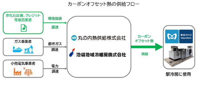 今回、東京メトロは丸の内熱供給株式会社及び池袋地域冷暖房株式会社が提供するオフセットクレジット※1や非化石証書等※2によりCO2がオフセットされた「カーボンオフセット熱メニュー」を導入することで、7駅の駅冷房等に使用する全ての熱をカーボンニュートラル化します。