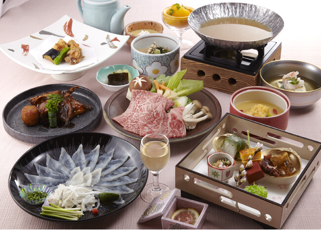 春帆楼阿倍野店では、春帆楼の自慢のとらふぐと、厳選した黒毛和牛、春野菜を使用した春を感じていただける会席料理をご用意いたしました。