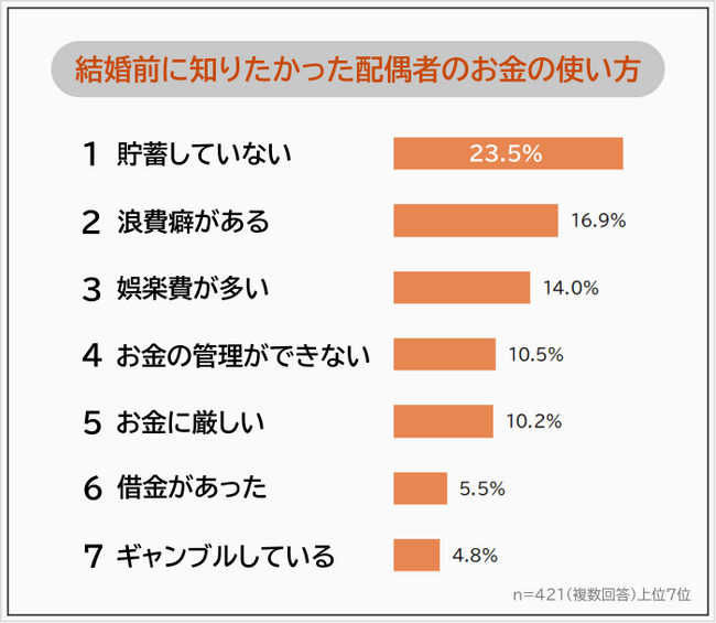 既婚男女421人に「結婚前に知りたかった配偶者のお金の使い方」を聞いたところ、1位は「貯蓄していない(23.5%)」でした。2位「浪費癖がある(16.9%)」、3位「娯楽費が多い(14.0%)」が続きます。