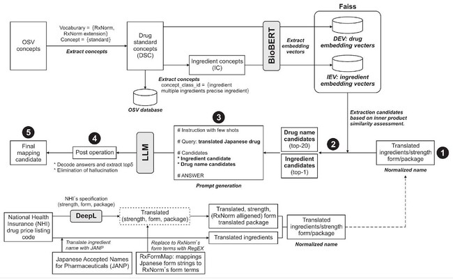 日本の研究者が国際的なリアルワールドデータ(以下「RWD」)研究へ参画することが困難な理由のひとつとして、日本の医薬品用語集が国際的な標準用語集と連携していないことが指摘されています。この課題に対し、Yuimediは愛媛大学と共同で大規模言語モデル(以下「LLM」)と検索拡張生成(以下「RAG」)を組み合わせて日本の医薬品用語を国際的な標準医薬品用語 RxNorm にマッピングする手法を研究・開発しました。この手法を用いてマッピングした成果を2名の薬剤師によってレビューの上、オープンデータとして公開しました。