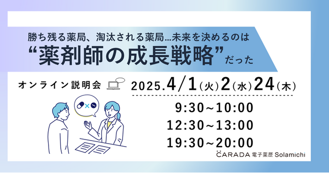 クラウド電子薬歴『CARADA 電子薬歴 Solamichi』の企画・開発・販売を行う株式会社ソラミチシステムは、無料オンラインセミナー「勝ち残る薬局、淘汰される薬局…未来を決めるのは“薬剤師の成長戦略”だった」を2025年4月1日(火)、2日(水)、24日(木)に 開催します。