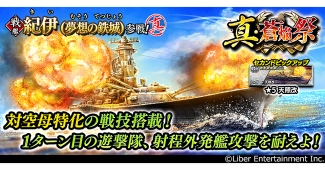 株式会社リベル・エンタテインメントが運営する本格海戦ゲーム『蒼焔の艦隊』(そうえんのかんたい、iOS/Android/DMM Games)は、2025年3月26日(水)よりサルベージ「真・蒼焔祭」を開催し、新たに戦艦「紀伊(夢想の鉄城)」が参戦することをお知らせいたします。