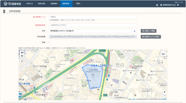 traevo Platform上で管理者が目的地登録をし、目的地となる施設にジオフェンス(円形、多角形による仮想エリア)を設定することで、車両が目的地に到着・出発した時間を車両動態から自動で記録でき、ドライバーの操作なしで滞留時間の把握と管理が可能となります。また物流事業者にとっても、本オプションの利用により発荷主・着荷主で発生した滞留時間を自動的に荷主に共有できます。