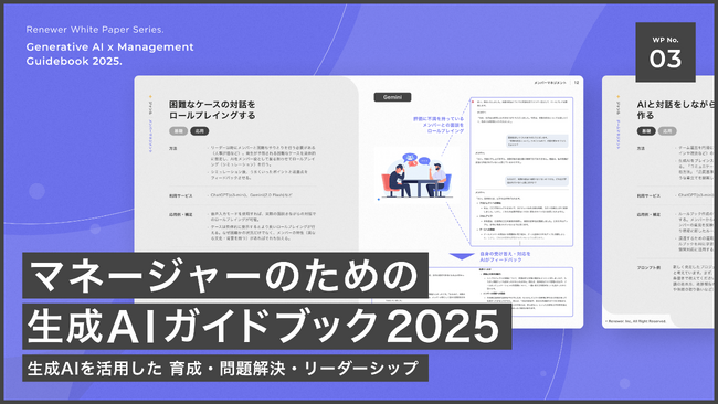 Renewerでは、「生成AI × アップスキリング」シリーズを通じて、生成AIを使って「人の力を高める方法」をわかりやすく紹介しています。その第3弾として、『生成AI × マネージャーガイドブック 2025』を公開しました。このガイドブックは、マネージャーやリーダーとして働く方のスキルアップをサポートし、マネジメント業務の負担を軽減することを目的としています。新年度からマネージャーやリーダーとしての役割を担うビジネスパーソンの、準備やスキルアップのためのガイドとしてもおすすめです。