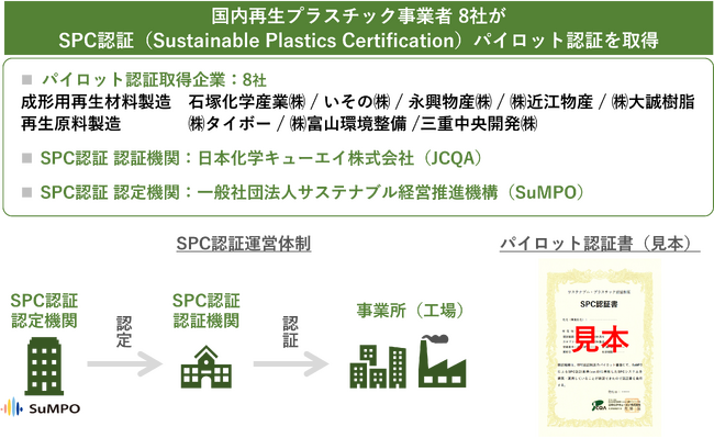 一般社団法人サステナブル経営推進機構(所在地:東京都千代田区、代表理事:壁谷武久、以下、「SuMPO(さんぽ)」)が運営機関を担う「SPC(Sustainable Plastics Certification)認証」について、2025年2月に国内再生プラスチック事業者8社がパイロット認証を取得しました。