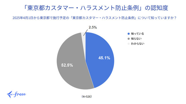 フリー株式会社(本社:東京都品川区、CEO:佐々木大輔、以下「freee」)は、2025年4月1日から東京都で施行される「東京都カスタマー・ハラスメント防止条例」(※1)の施行に伴い、東京都内の経営者・人事労務担当者526名を対象に実施したカスタマーハラスメント防止条例に関する調査データを公開しました。