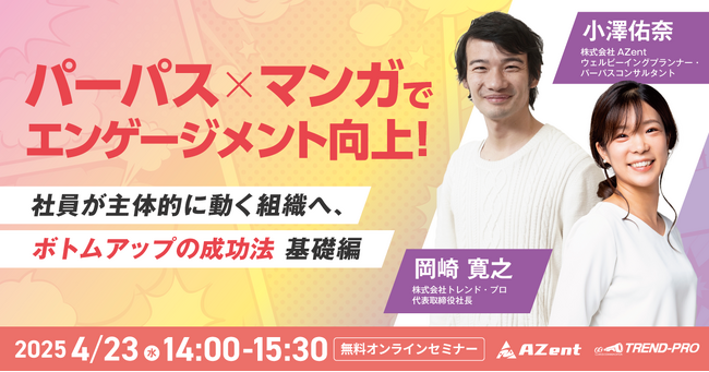 株式会社トレンド・プロ(本社:東京都港区、代表取締役社長:岡崎寛之、以下トレンド・プロ)は、株式会社AZent(本社:東京都港区、代表取締役:柳沼圭佑、以下AZent)と共同で、パーパス×マンガでエンゲージメントを向上させる成功法を解説するオンラインセミナーを4/23(水)14時から開催いたします。