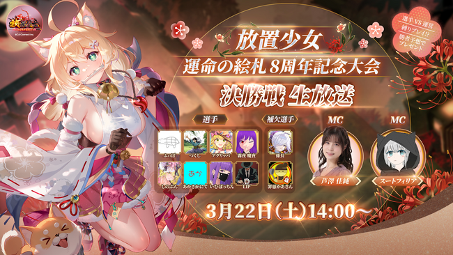 2025年3月22日(土)に≪放置少女≫8周年記念大会『運命の絵札』が開催されました。本大会には、予選からスコアランキング、予選ポイントランキング、対局数ランキングを基に選抜された8名の選手と、Discord選抜から2名の補欠選手の合計10名が集結し、白熱した戦いを繰り広げました。