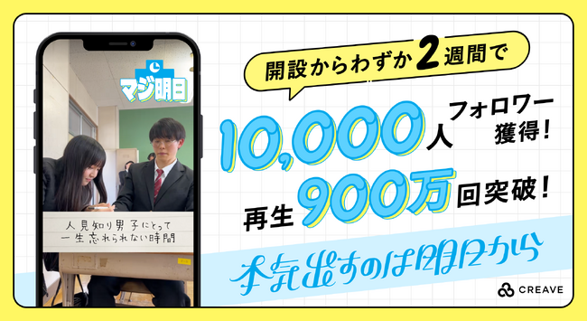 クリエイターとの共創を通じて企業のマーケティング課題を解決する、株式会社CREAVE(本社:東京都千代田区、代表取締役社長:中村真奈、以下 CREAVE)は、自社IPとしてバーチャルショートドラマ*(以下VSD)「本気出すのは明日から。」のTikTokアカウントを開設し、2月18日の投稿開始から、約2週間で10,000フォロワー・総再生回数900万回、1ヶ月で13,000フォロワー・総再生回数1,000万回を突破*しました。