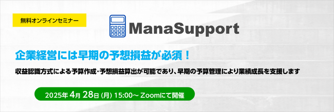 株式会社ニーズウェル(本社:東京都千代田区、代表取締役会長兼社長 船津浩三)は、2025年4月28日(月)15時より、無料オンラインセミナー「企業経営をサポートする予想損益シミュレーション「ManaSupport」~企業経営には早期の予想損益が必須!収益認識方式による予算作成・予想損益算出が可能であり、早期の予算管理により業績成長を支援します~」を開催します。