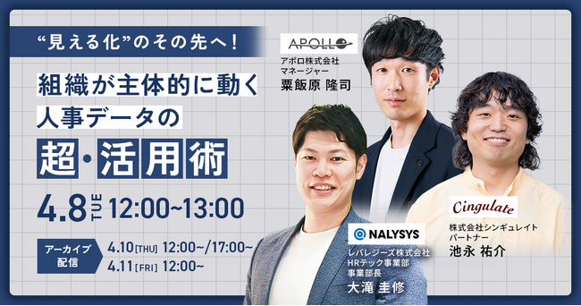科学とデータの力で組織開発を支援する株式会社シンギュレイト(本社:東京都渋谷区、代表取締役:鹿内 学、以下シンギュレイト)は、レバレジーズ株式会社が主催する「"見える化"の先へ!組織が主体的に動く人事データの超・活用術」に登壇することが決定いたしました。このイベントは2025年4月8日(木)12:00~13:00でライブ配信、その他3日程にてアーカイブ配信で開催されます。