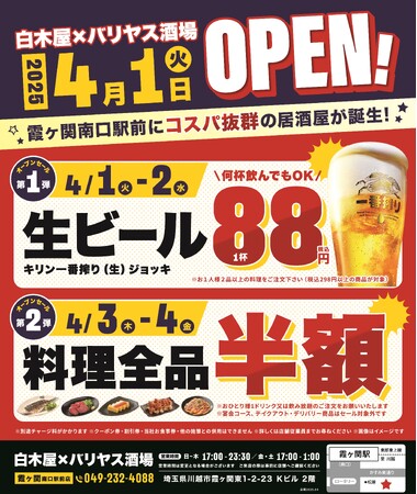 2025年4月1日(火)埼玉県川越市の霞ヶ関南口駅前に、コスパ抜群の新しい居酒屋「白木屋×バリヤス酒場」が誕生!