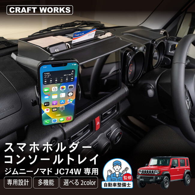 車種専用カーグッズを販売するクラフトワークスからジムニーノマド専用「スマホホルダーコンソールトレイ」が早くも登場。ナビ周りの利便性を高めるコンソールトレイです。カラーや形状を選べるデザイン4種類。