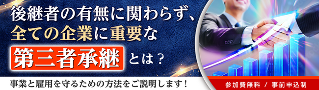 中小企業の経営層向けオンラインセミナー「後継者の有無に関わらず、全ての企業に重要な第三者承継とは?」では後継者不在の場面に直面した企業の対応事例のご紹介を通じ、事業承継・M&Aについての不安やマイナスイメージを払拭し、正しい知識を習得することができます。長年営んできた思いのある事業と、一緒に働いてきた従業員の雇用を守るためにぜひご参加ください。また、成長戦略としてM&Aに取り組みたい中小企業経営者様もぜひご参加ください。