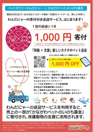 専用のQRコードまたはURLからご予約いただくと、送迎サービス1回ごとに1,000円が『かながわペットのいのち基金』に寄付されます。また、ご利用いただいた皆さまへの感謝の気持ちとして、送迎料金から1,000円を割引(往復の場合は3,000円割引)いたします。