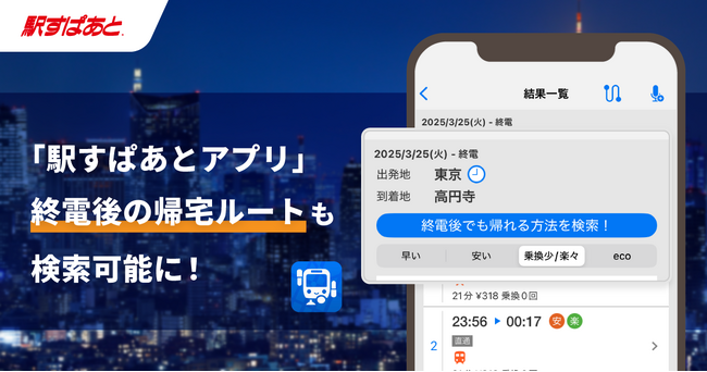 経路検索サービス「駅すぱあと」を提供する株式会社ヴァル研究所(本社:東京都杉並区、代表取締役:菊池 宗史)は、「駅すぱあとアプリ(iOS版)」(以下「駅すぱあとアプリ」)にて、2025年4月2日(水)より「終電後検索」機能の提供を開始しました。