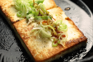 石豆富は、その堅さから、焼く・炒める・揚げるなど、どんな調理方法にも向いています。白川郷の位置する飛騨地域では、豆腐ステーキが名物として知られており、石豆富は特に豆腐ステーキに向いている食材です。その理由は、石豆富の調理のしやすさ。石豆富は製造工程で水分をしっかりと抜いるため、調理する際の水切りは不要です。お好きな厚みにスライスして、多めの油でじっくり焼くだけで、外はカリっと中はふわっとした石豆富ステーキが完成します。