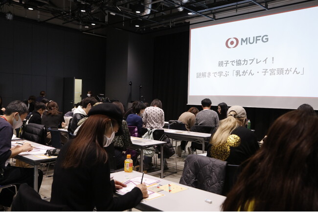 MUFGは2022年よりJSFPへの支援を始め、急増する乳がんや子宮頸がんの知識の向上や予防のための情報発信に取り組んできました。今回は、若い世代の方にも興味関心を持ってもらえるよう、若年層に人気の高い「謎解き」を活用した、体験イベントを実施。謎解き体験イベント後は、JSFPの先生方による乳がん・子宮頸がんに関する講義も開催しました。当日は50名以上が参加し、10歳前後のお子さまから親世代まで、男女問わず幅広い年代の方々に参加いただきました。