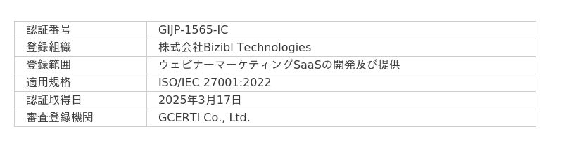 弊社が提供するウェビナーマーケティングSaaS「Bizibl」は、申し込み者の姓、名、メールアドレスなどの個人情報を取り扱うため、情報セキュリティの確保が重要なサービスとなります。特に、ウェビナーの運営・管理を支援するプラットフォームとして、お客様に安心してご利用いただけるよう、高いセキュリティ基準の維持・向上に取り組んできました。