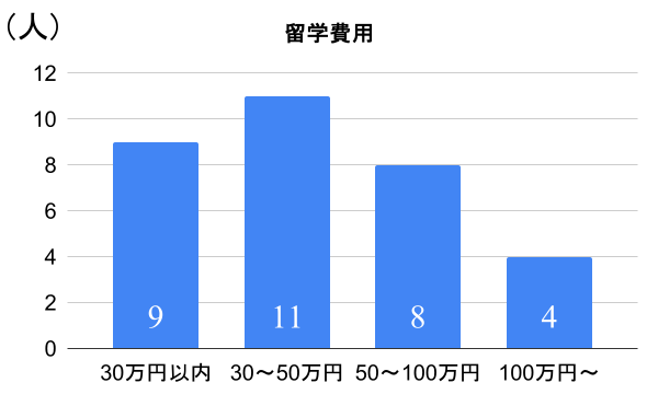 フィリピンの留学費用は安いことで有名ですが、実際に20人(約60%)の人が50万円以内で留学できたということがわかります。