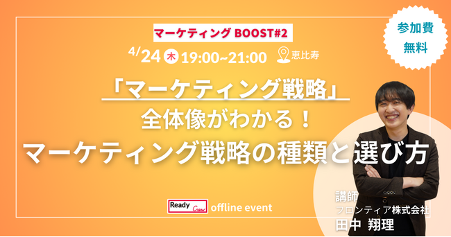 ビジネスマッチングサービス「Ready Crew(レディクル)」を運営するフロンティア株式会社(本社:東京都渋谷区、代表取締役社長:高橋 政裕、以下 当社)は、2025年4月24日(木)に「マーケティングBOOST #2『マーケ戦略の全体像』」を開催いたします。