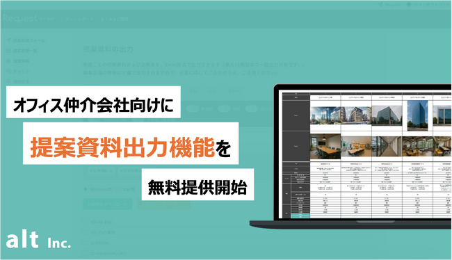 株式会社alt(本社:東京都渋谷区、代表取締役:石原一樹)が提供するフレキシブルオフィスの提案依頼サービス「Request」は、オフィス仲介会社向けに提案資料出力機能を新たにリリースしました。これにより、オフィス仲介担当者は「明細資料」や「比較表」を、Excel形式で簡単に出力できるようになり、提案資料の作成工数を大幅に削減できます。