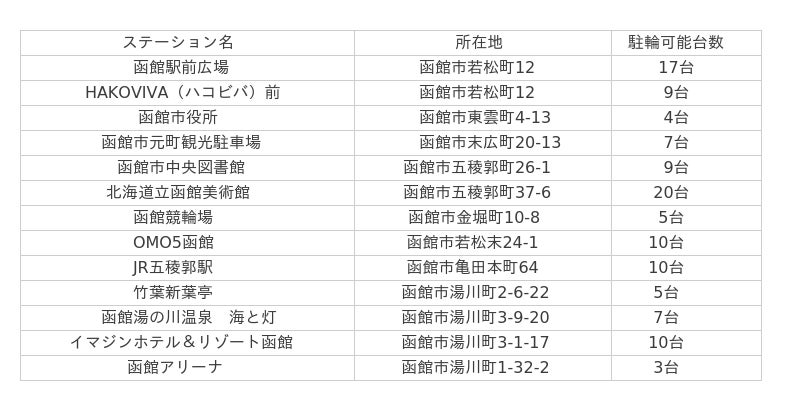 函館駅前広場やJR五稜郭駅等、函館市内13カ所にステーションを設置