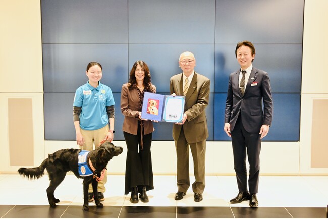 右よりウエインズトヨタ神奈川株式会社 執行役員 レクサス事業責任者 竹崎裕視氏、代表取締役会長 宮原郁生氏、シャイン・オン!キッズ 理事長 キンバリ・フォーサイス、トレーナー 池上茉実と候補犬ソラ