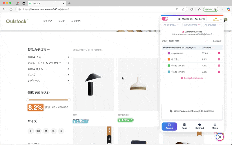 ページ上でクリックするだけで各箇所やページのパフォーマンスを分析できます