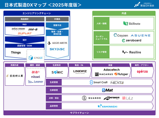 製造DX協会が、日本の製造業が抱える課題や、スタートアップが提供するソリューション領域を整理し、「日本式製造DX」を実現するための包括的な整理図として作成したカオスマップです。日本のものづくり現場は高度な現場力を武器に高品質を維持してきた一方で、デジタル技術の導入が十分に進んでいない現場も多いのが実情です。こうした状況を踏まえ、製造DX協会では製造業とスタートアップの橋渡しを目指し、様々な領域で活躍する企業を体系的に整理したものです。