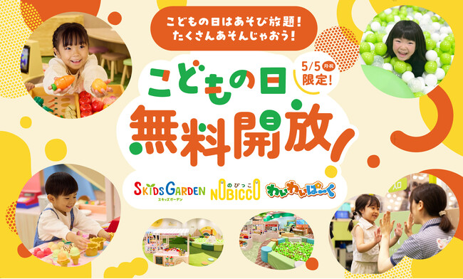 株式会社イオンファンタジー(本社:千葉県千葉市、代表取締役社長:藤原徳也、以下、当社)は、「こどもの日」(5月5日)を記念し、遊びを通じてこどもたちの健やかな成長が育まれることを願い、当社が運営するプレイグラウンド・時間制遊具施設の「スキッズガーデン」「のびっこ」「わいわいぱーく」 等全国200 カ所以上において、施設の無料開放を実施いたします。昨年は約3万人のお子さまが参加し、毎年大変ご好評をいただいているイベントです。