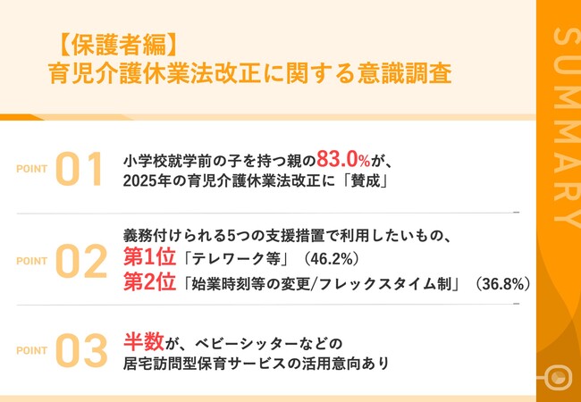 - 01|小学校就学前の子を持つ親の83.0%が、2025年の育児介護休業法改正に「賛成」