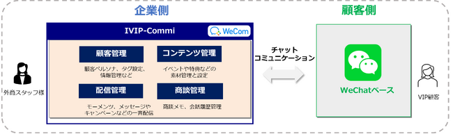 来店したVIP顧客がIVIP- Commiにユーザー登録をすることで、ペルソナ情報を収集し、ターゲット層を絞った上で最適なプロモーションが可能となる。具体的には、収集した情報にタグ付けし、ターゲットへの一斉送信や、モーメンツ発信(画像・映像を交えた投稿機能)ができるだけでなく、1対1の個別チャットにより離日後であっても濃厚なコミュニケーションを継続できる。