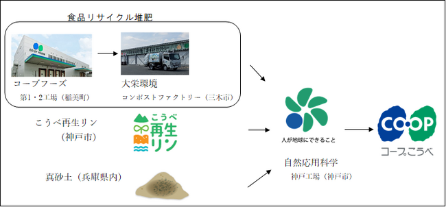 コープフーズの第1・2工場で発生する食品廃棄物を、大栄環境のコンポストファクトリー(三木市)で堆肥化した「食品リサイクル堆肥」に加え、神戸市の下水処理場から回収した「こうべ再生リン」や、県内産の真砂土などを原料とし、自然応用科学の神戸工場(神戸市北区)で製品化、兵庫県内で供給する「土の地産地消」をめざします。