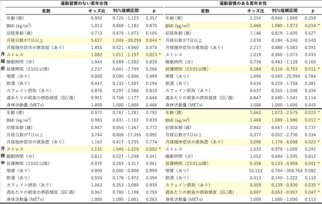 その結果、運動習慣のない若年女性では、重度の症状を有することと月経日数が長いこと、ストレスレベルが高いことに関連が認められました。一方、運動習慣のある若年女性では、重度の症状を有することとBMIが高いこと、就寝時間が遅いこと、月経随伴症状を有している、または有する家族がいること、カフェインの摂取があること、週あたりの朝食摂取頻度が少ないことが関連していることが明らかになりました。以上のことから、月経随伴症状の重症度に影響を与える要因は、運動習慣の有無によって異なる可能性が示唆されました。
