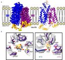 a. 尿酸結合型GLUT9の3次元マップ(左)とモデル(右)。細胞内外を隔てる脂質二重膜を薄い黄色で示している。