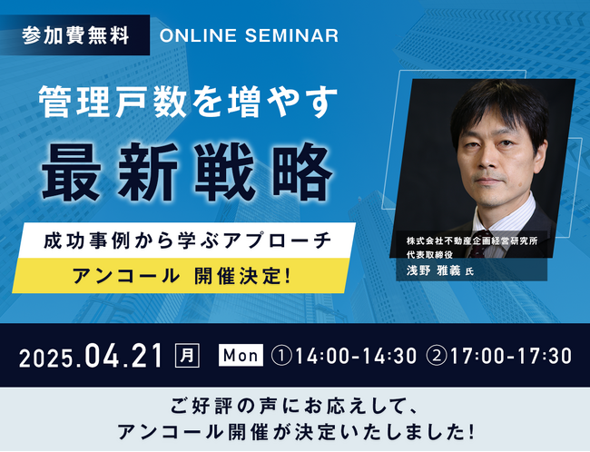 【ご好評の声にお応えし、ウェビナーのアンコール開催決定!】管理戸数を増やす最新戦略~成功事例から学ぶアプローチ~ 4月21日(月)に参加費無料で開催決定!