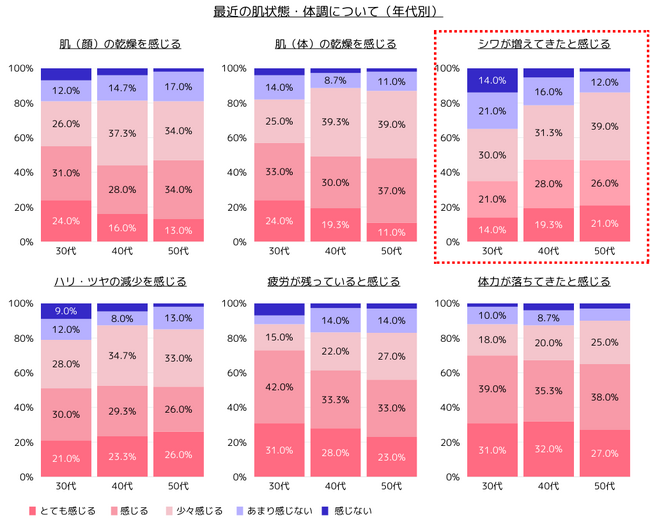 肌(顔)の乾燥や体力の衰えなど、加齢に伴い変化を感じる方が増加すると想定していましたが、肌の乾燥やハリ・ツヤ、疲労感などは加齢による差異は殆どなく、それに対してシワが増えてきたと感じている方は30代では65.0%、40代では78.7%、50代では86.0%と年を重ねるごとに大きく増加することがわかりました。[画像1: https://prcdn.freetls.fastly.net/release_image/18359/4/18359-4-3bce764e2618360da501fe075c6c1dbc-1017x814.png?width=536&quality=85%2C75&format=jpeg&auto=webp&fit=bounds&bg-color=fff ]