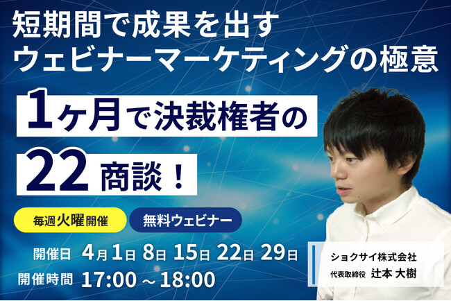 ショクサイ株式会社(代表取締役:辻本 大樹)は4月1日(火)17時よりBtoBマーケティング担当者向けに「1ヶ月で決裁権者の22商談!短期間で成果を出すウェビナーマーケティングの極意」を開催いたします。