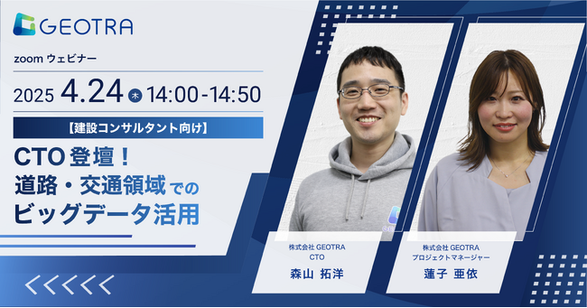 株式会社GEOTRA(本社:東京都千代田区、代表取締役社長:陣内 寛大、以下GEOTRA)は2025年4月24日(木)に建設コンサルタント業界の皆様向けのオンラインセミナー『CTO登壇! 道路・交通領域でのビッグデータ活用』を開催いたします。
