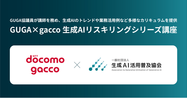 生成AIを社会に実装し、産業の再構築を目指す一般社団法人生成AI活用普及協会(理事長:井畑 敏、所在地:東京都港区、以下:GUGA)は、株式会社ドコモgacco(代表取締役CEO:佐々木 基弘、所在地:東京都港区、以下:ドコモgacco)が運営する国内最大級のオンライン動画学習サービス「gacco」において、「GUGA×gacco 生成AIリスキリングシリーズ講座」を開講することをお知らせいたします。また、本講座の導入編として、生成AIリスキリングの基本や生成AI活用のリアルをテーマにした特別共催ウェビナーを2025年4月21日(月)に開催いたします。