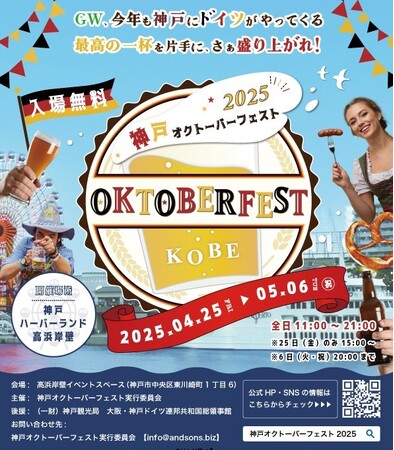 神戸オクトーバーフェスト実行委員会は「神戸オクトーバーフェスト2025」を4月25日(金)~5月6日(火・振休)、 神戸ハーバーランドumie・モザイク前の高浜岸壁にて開催いたします。