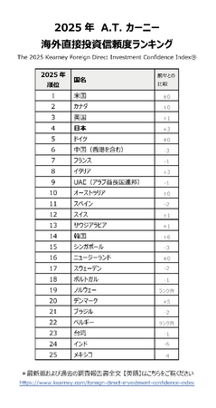 経営コンサルティング会社A.T. カーニー(グローバル・ブランド名はKEARNEY)のマクロ経済部門シンクタンクであるグローバル・ビジネス・ポリシー・カウンシル(米国バージニア州アーリントン、以下GBPCと称す)は、「2025年 海外直接投資信頼度指数(The 2025 Kearney Foreign Direct Investment Confidence Index(R)、以下FDICI)調査結果を公開し、投資先として魅力のある国上位25カ国を発表しました。