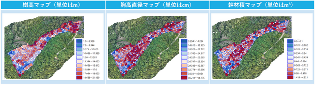 ・ドローンと画像認識AIを活用することで、広葉樹の植栽状況(資源量)のデジタル化を実現し、森林の樹種・樹高・蓄積・CO2吸収量等を推定できました。(図1・図2)