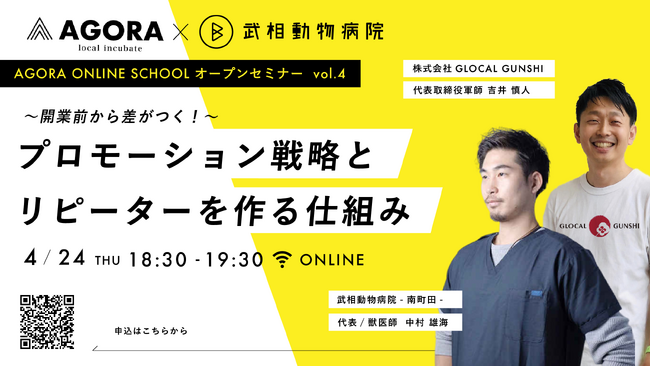 株式会社AGORA(本社:東京都町田市)は、起業に役立つ創業WEBセミナーを毎月開催。今回は開業前からの効果的なプロモーション戦略で地域に根付く動物病院を創り上げた、武相動物病院(読み:ぶそうどうぶつびょういん 最寄り:南町田グランベリーパーク駅)代表/獣医師の中村雄海(なかむらゆうみ)氏と、東京都認定インキュベーション施設にて年間400名を超える起業相談を受けている吉井慎人(よしいまこと)氏が体験談をもとに解説します。