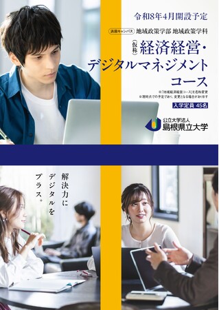 令和8年4月、公立大学法人島根県立大学浜田キャンパスの地域政策学部 地域政策学科 地域経済経営コースを「経済経営・デジタルマネジメントコース(仮称)」に名称変更します。この名称変更にともない、情報教育を充実強化し、地域のDX化を推進する人材の育成を加速させます。