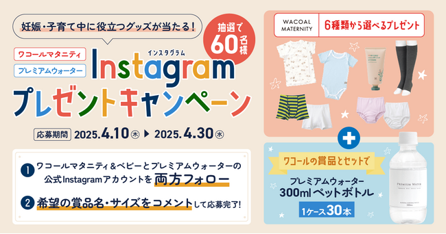 4月10日(木)~ 4月30日(水)のキャンペーン期間中に、ワコールマタニティ&ベビーとプレミアムウォーターの公式アカウントを両方フォローし、対象の投稿に「希望の賞品名」、「サイズ」をコメントしていただいた方の中から抽選で60名様にワコールマタニティ&ベビーとプレミアムウォーターのおすすめ賞品をプレゼントいたします。
